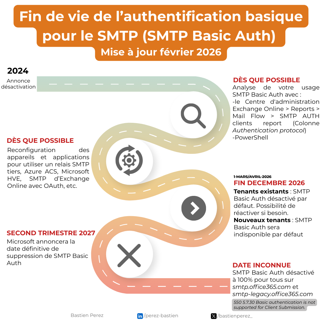 - Deuxième semestre 2027 : Microsoft annoncera la date définitive de suppression de SMTP Basic Auth.