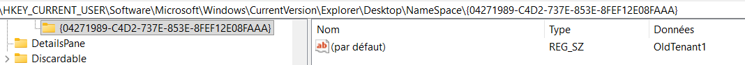 Pour supprimer l'icône de l'ancien tenant, accédez à HKEY_CURRENT_USER\Software\Microsoft\Windows\CurrentVersion\Explorer\Desktop\NameSpace et trouvez la clé de l'organisation que vous souhaitez supprimer.